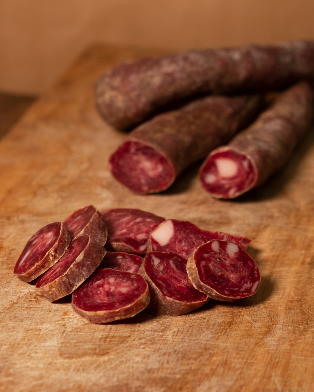 La tradizione campana in un prodotto unico: carne pregiata di Maiale Nero Casertano, razza autoctona dal sapore inconfondibile, con Sale Integrale di Trapani e Miele Millefiori dell'Agro.