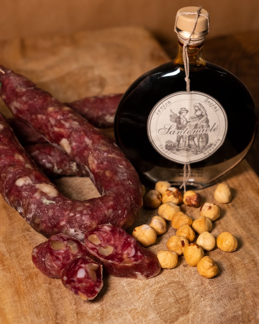 L'eccellenza della norcineria campana: la croccantezza delle Nocciole di Giffoni IGP incontra la dolcezza della Melassa di Fichi del Cilento Santomiele.