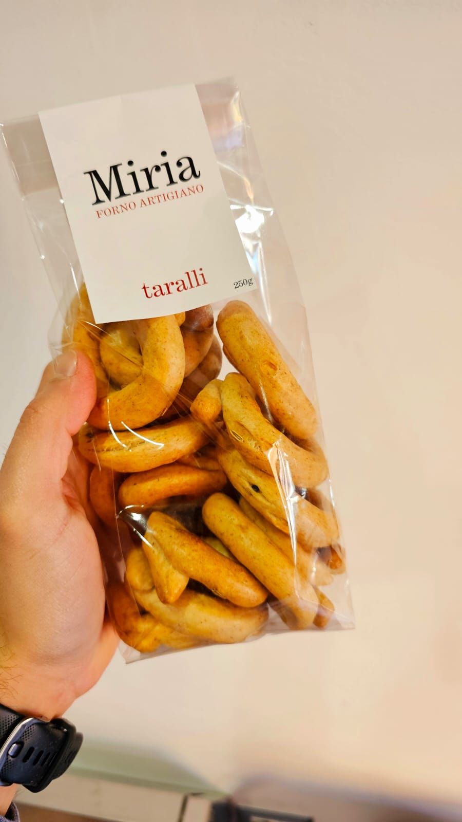 taralli prodotti dal micro panificio Miria, prodotto solo con farine biologiche macinate a pietra del Mulino Agostini e Sobrino, Sale Marino Integrale presidio Slow Food ,Pasta madre viva e acqua e Olio Extravergine D'oliva BIO